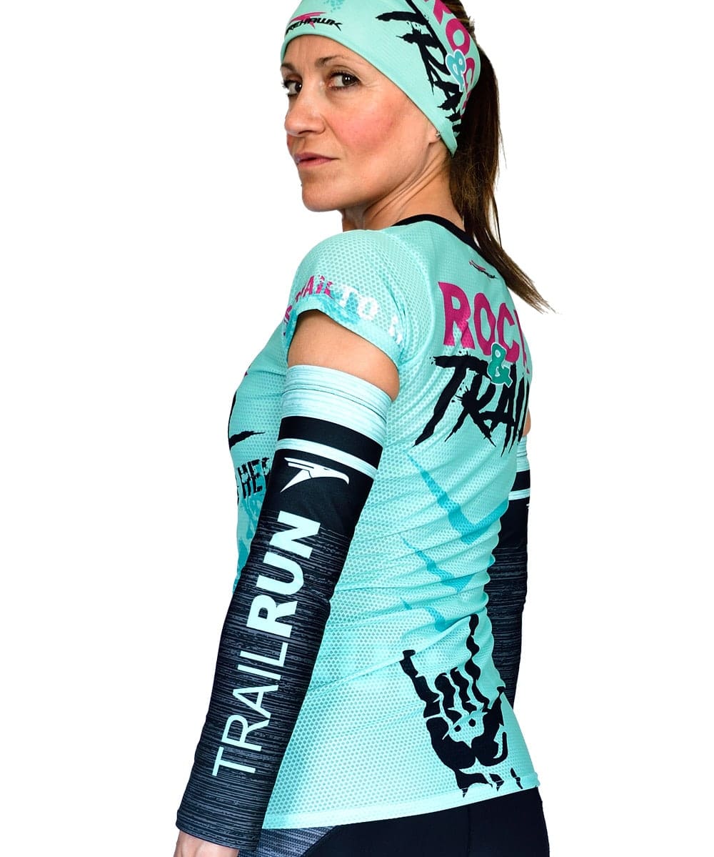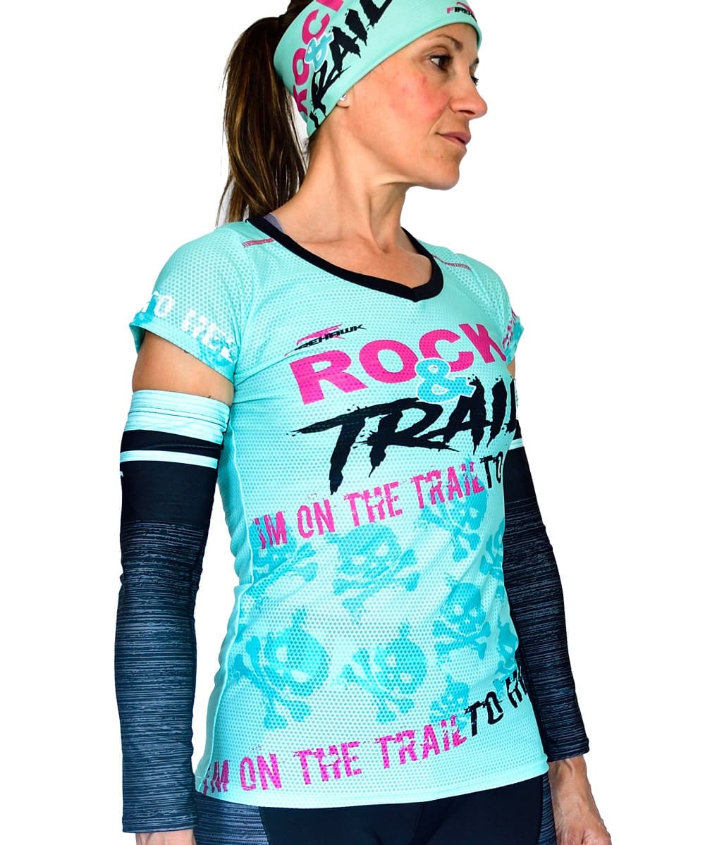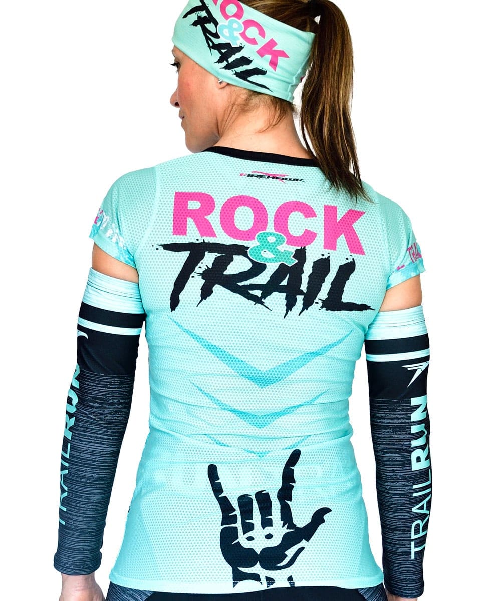 Camiseta Técnica de trail running para Mujer modelo Rock&trail diseñada con tejido de alta tenacidad, transpirable y rápido secado. Peso estimado de 75gr en talla M.