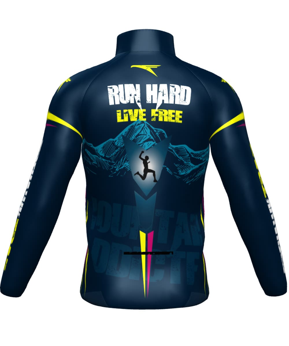 Chaqueta cortavientos Técnica de cuello recto y linea PRO para Eventos de Running y trail running personalizada con diseño previamente acordado con el cliente. Dispone de bolsillo trasero con cremallera.